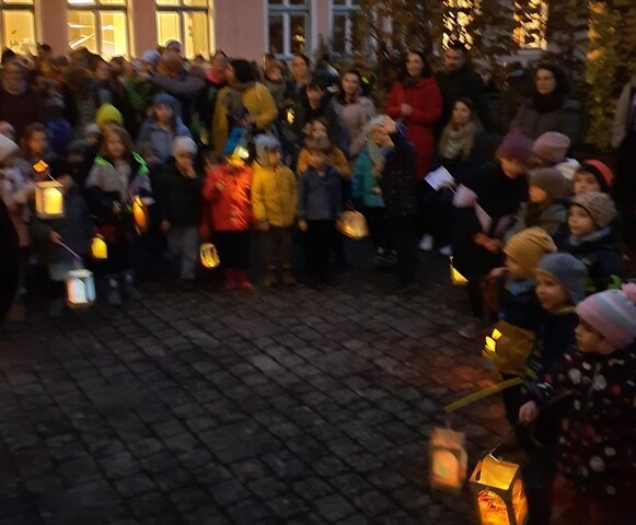Der bewusst kurz gewählte Weg wurde in diesem Jahr durch Akkordeonklänge begleitet. Diese beiden kräftigen Instrumente vermochten es den Liedern einen stärkeren Ausdruck zu verleihen. Waren die Kinder durch Laternen, Fackeln usw. abgelenkt und vergasen dadurch das Singen, gelang es doch die Straßen mit Musik zu füllen. Kaum war das Zugende losmarschiert, bog der Zuganfang auch schon in die Zielgerade ein. So war der Weg auch für die jüngeren Kindern mit ihren Laternen gut zu Fuß zu bewältigen.